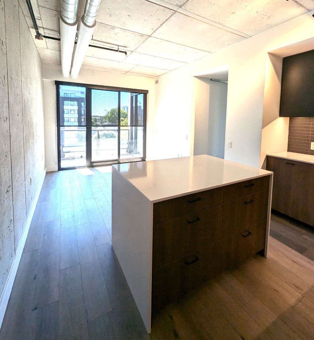 Located on the 6th floor, this two-bedroom, two-bathroom condo is west facing with an abundance of natural light. Beautiful modern kitchen with breakfast bar, wall oven, stove top, dishwasher, microwave and a refrigerator which blends into the cabinetry. Kitchen overlooks combined living/dining area with large, bright windows and balcony access.
