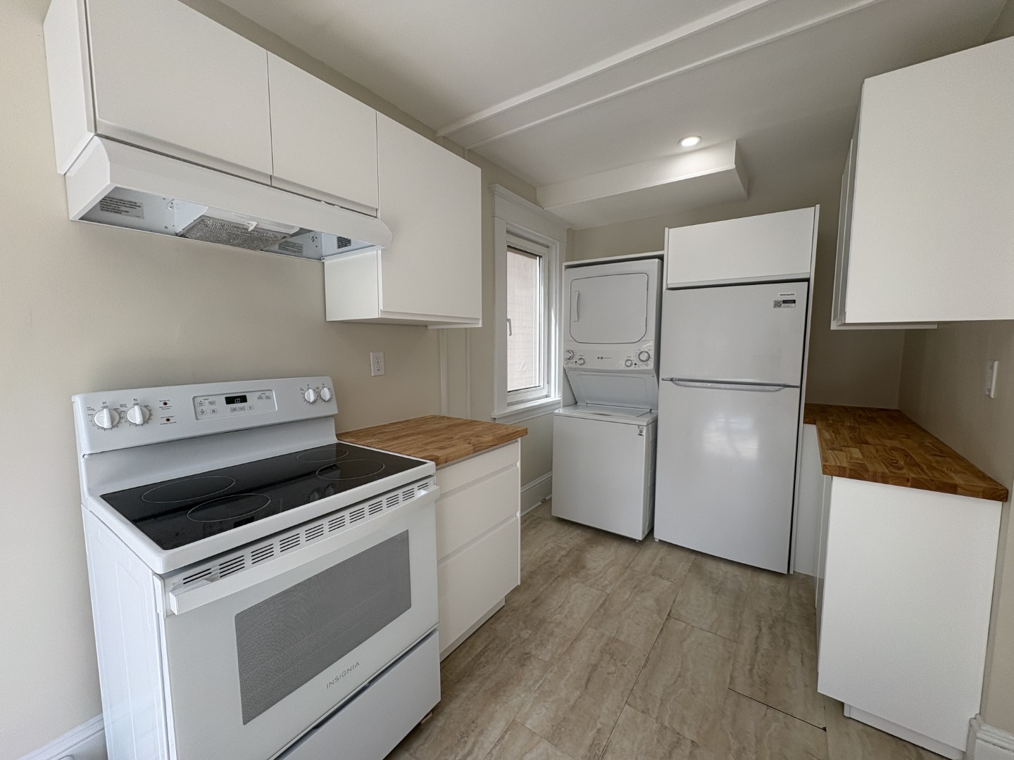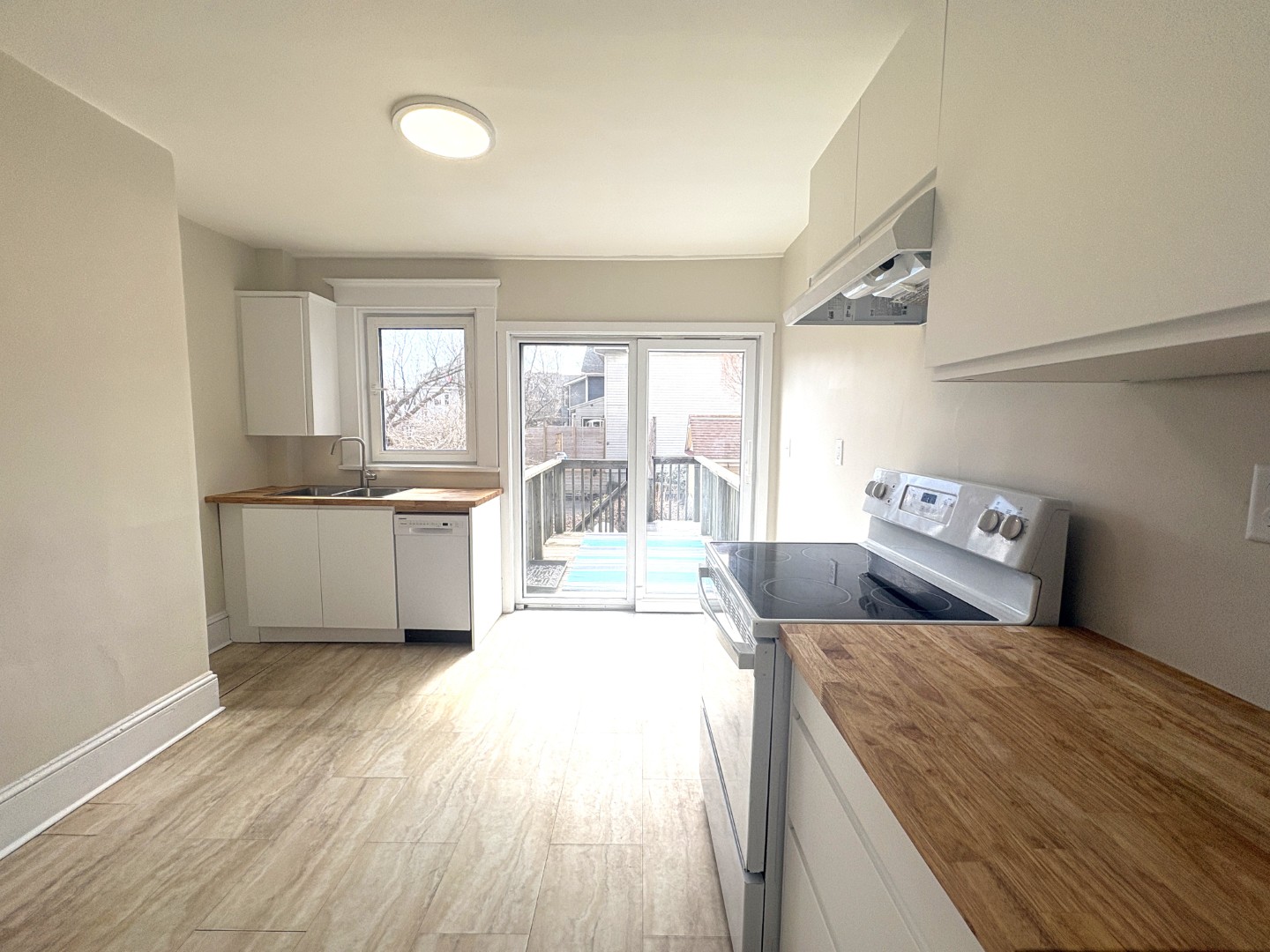 Big living room at the front of the home and two good sized bedrooms. One full bath. Kitchen has just been renovated with new Ikea cabinets, butcher block countertops, new washer/dryer, double sinks and patio doors to your private deck overlooking the sizable, shared yard.