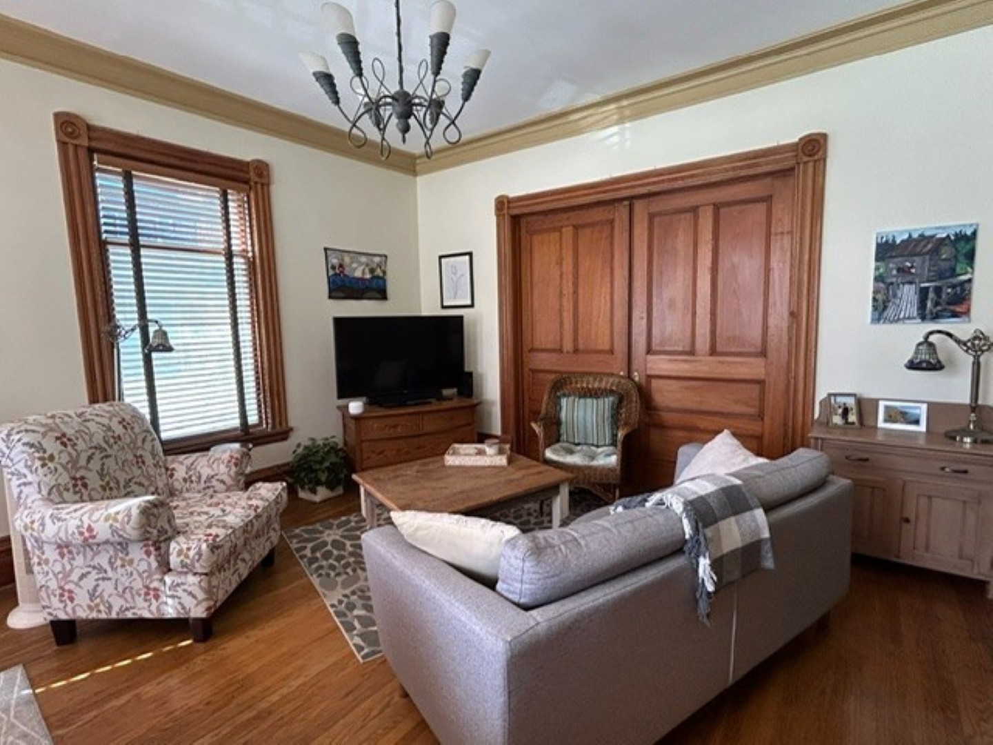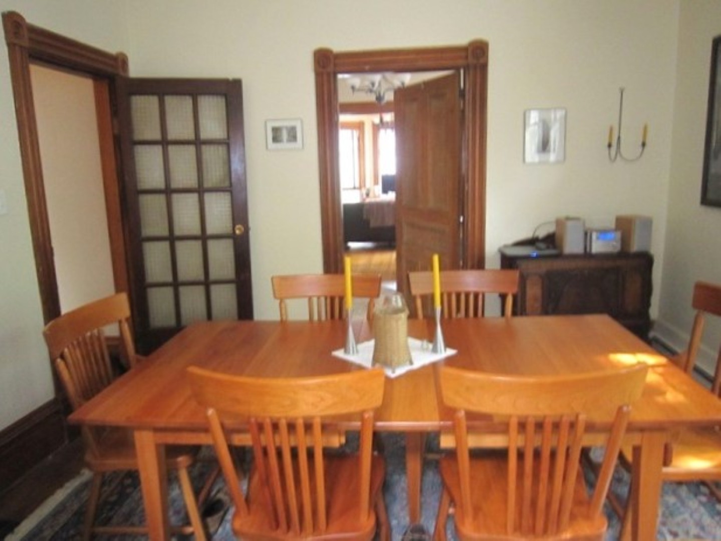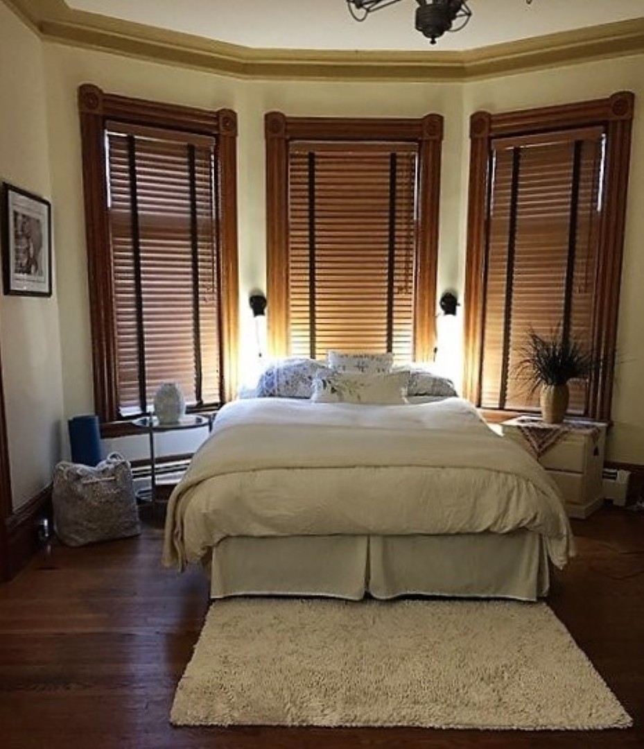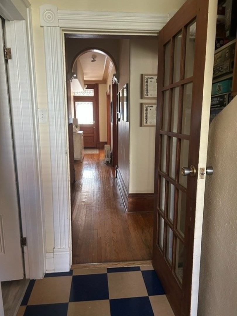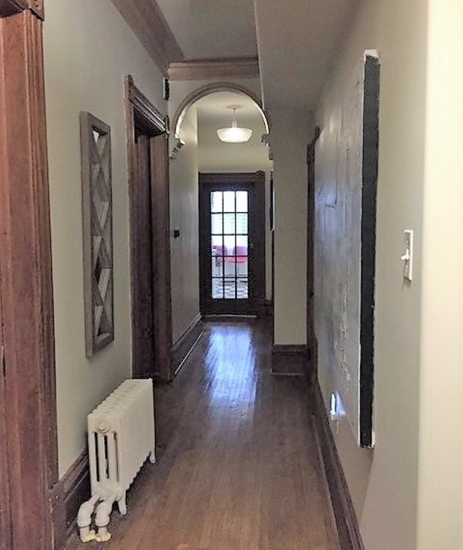 Hardwood and tile floors throughout; original pocket doors and wood trim, high ceilings, cove mouldings and ornamental fireplaces, one with oak mantle. Two large rooms may be used for either living or bedrooms and another large room can be used as a den or dining room.