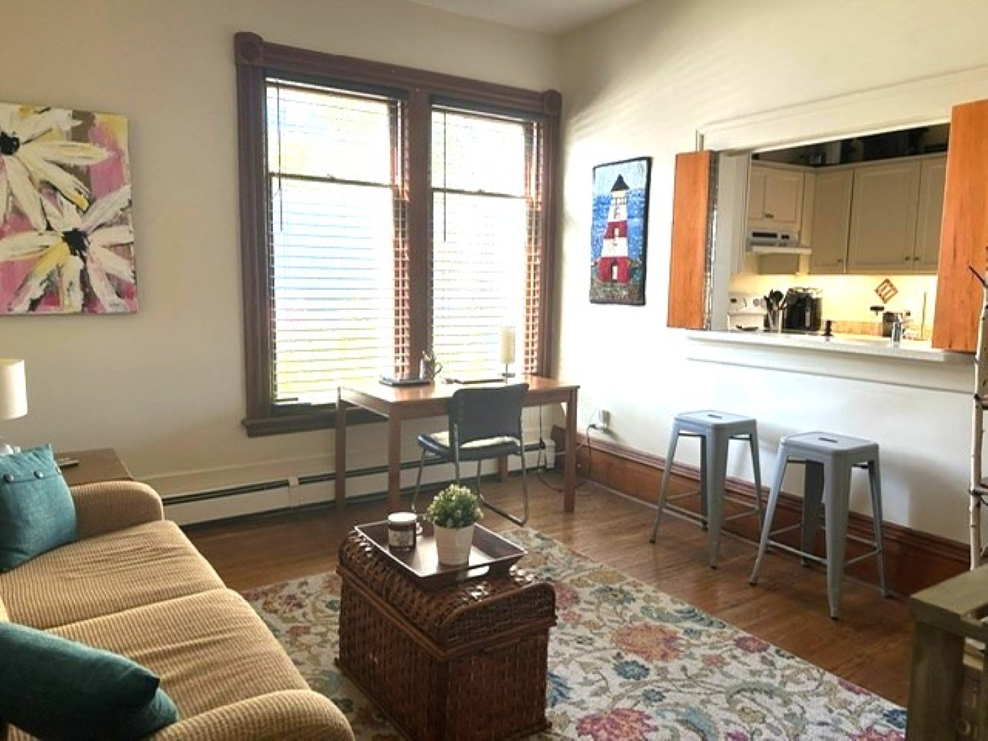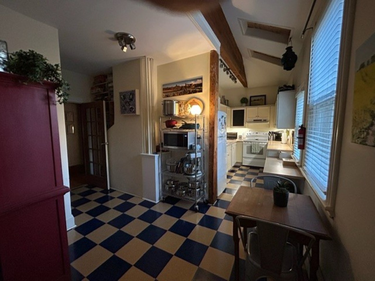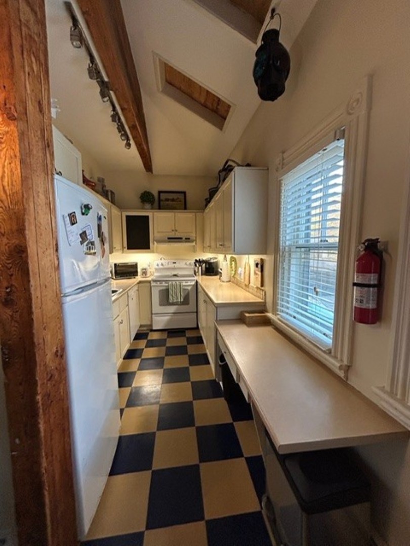 Galley kitchen has exposed beams plus a small breakfast area. Range, fridge and dishwasher provided. Back entrance mudroom leads down to the basement laundry/storage room with private washer/dryer.