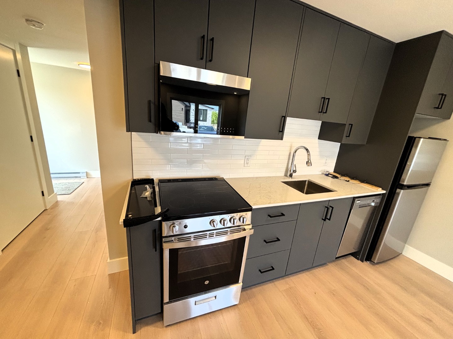 Open concept kitchen, dining and living area. All new appliances in kitchen including a dishwasher and rangehood microwave.