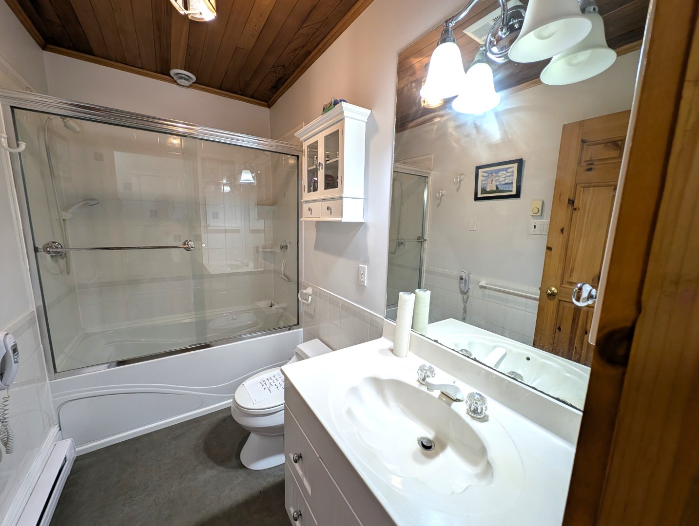 Great bathroom with soaker tub, timed heat lamp and an attractive, large vanity.