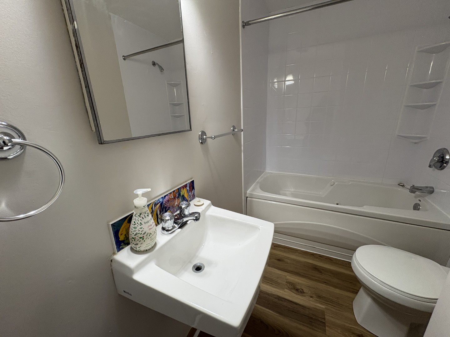 Main floor has a large, bright living room at the front of the building, a galley style kitchen and a dining area with doors to patio at the back. Lower level has two good sized bedrooms and full bath. Laminate flooring throughout with carpet on stairs only.