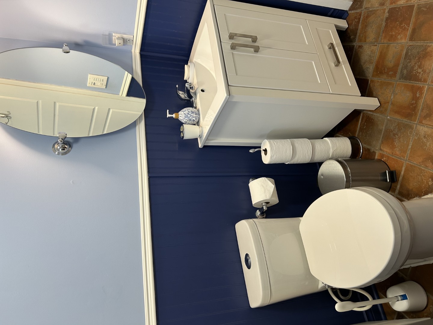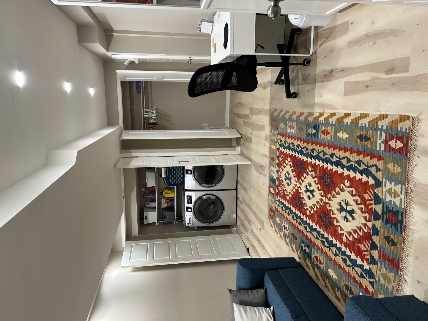 Laundry closet with full size washer and dryer. Full bath with soaker tub, bidet and storage.
