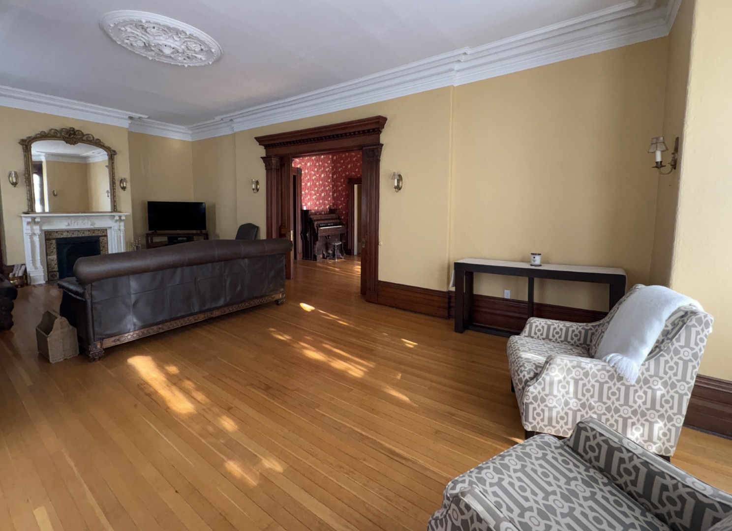 Original ornate glass doors welcome you into this stunning home filled with original gleaming woodwork, crown mouldings and high ceilings. Living and dining area enjoy the warmth of a propane fireplace. Powder room off main foyer. Home office leads into the beautiful kitchen with huge centre island and laundry closet.