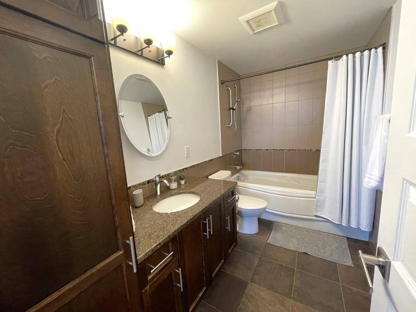 Primary bedroom with King bed, large walk-thru closet and ensuite with two vanities, tub and separate shower. Second large bedroom with Queen bed and office nook. Second full 4-pce bath.