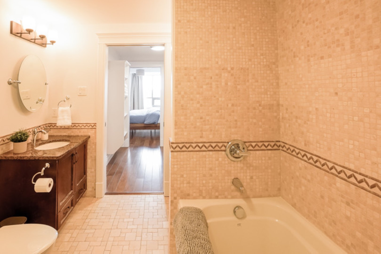 This two-bedroom, two-bathroom condo offers a fully stocked efficient kitchen with breakfast bar and dining area. Spacious living area with chic but comfortable furnishings, hardwood flooring, electric fireplace and sitting area overlooking South Park St. Lovely spot for entertaining.