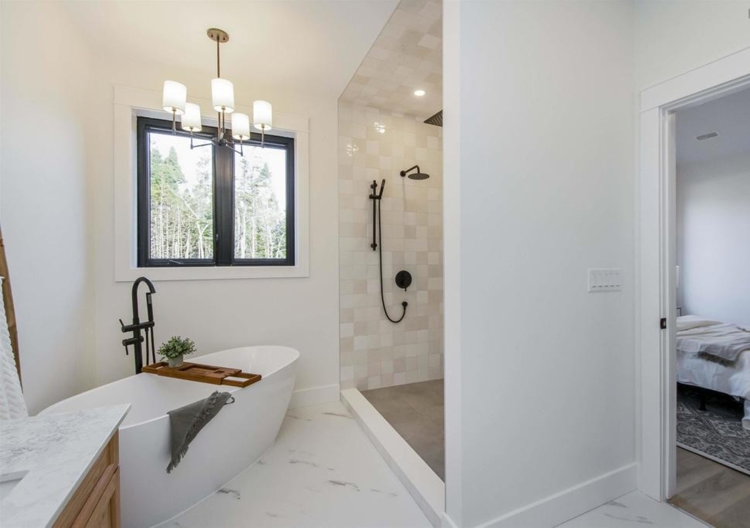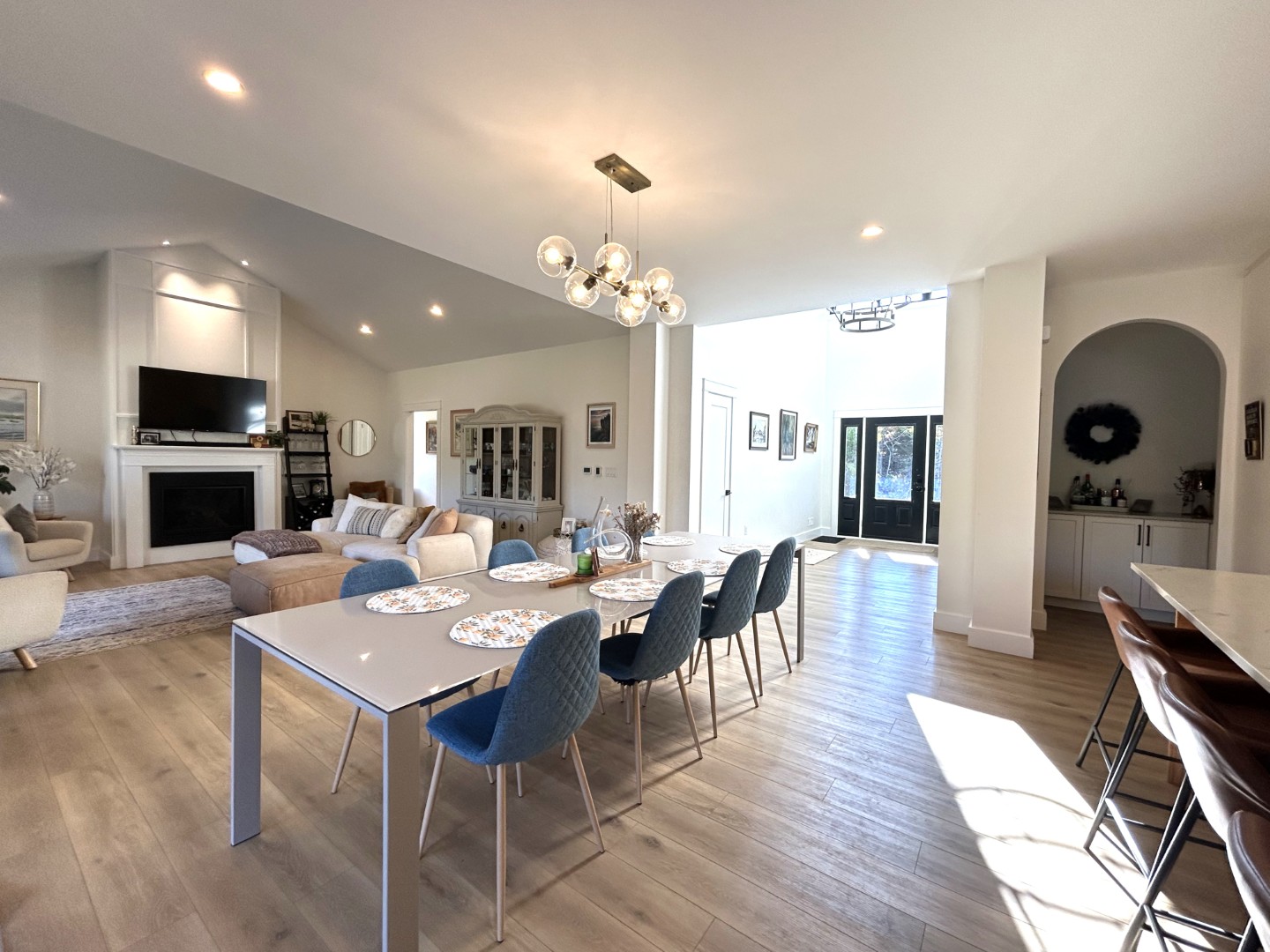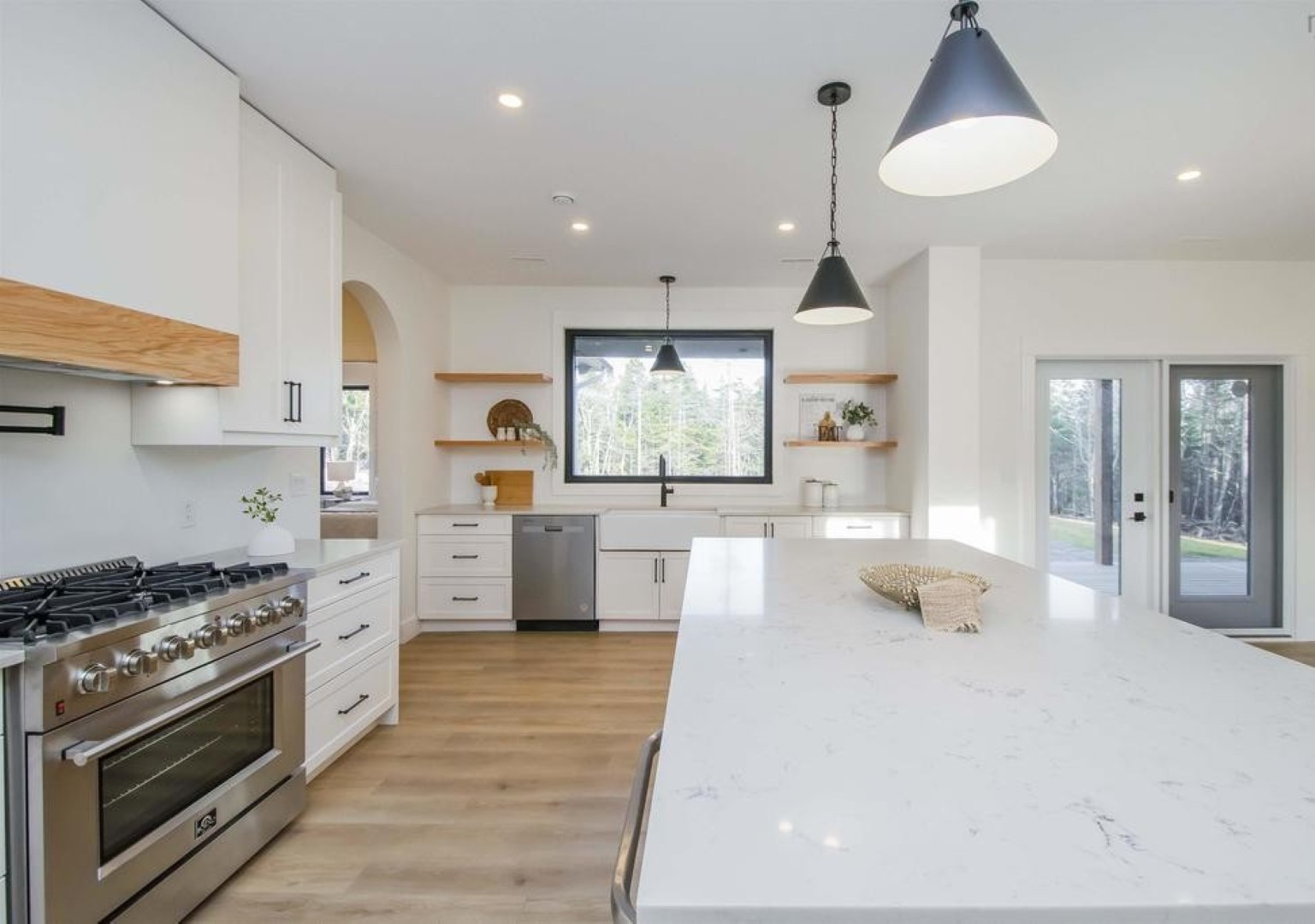 Exquisite interior with 21-foot ceilings and full-length windows to flood the space with natural light. Home office at front of the home off the foyer. A chef’s dream kitchen with 6 burner propane stove and massive island overlooking the grand open concept dining and living area with gorgeous propane fireplace. From here move seamlessly to the ground-level covered patio.