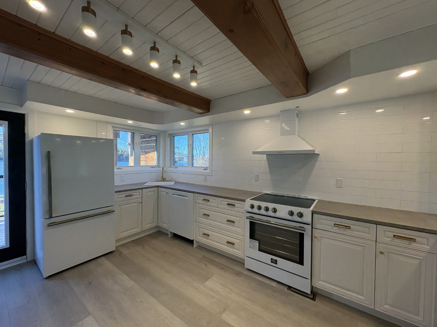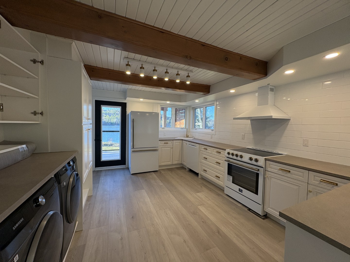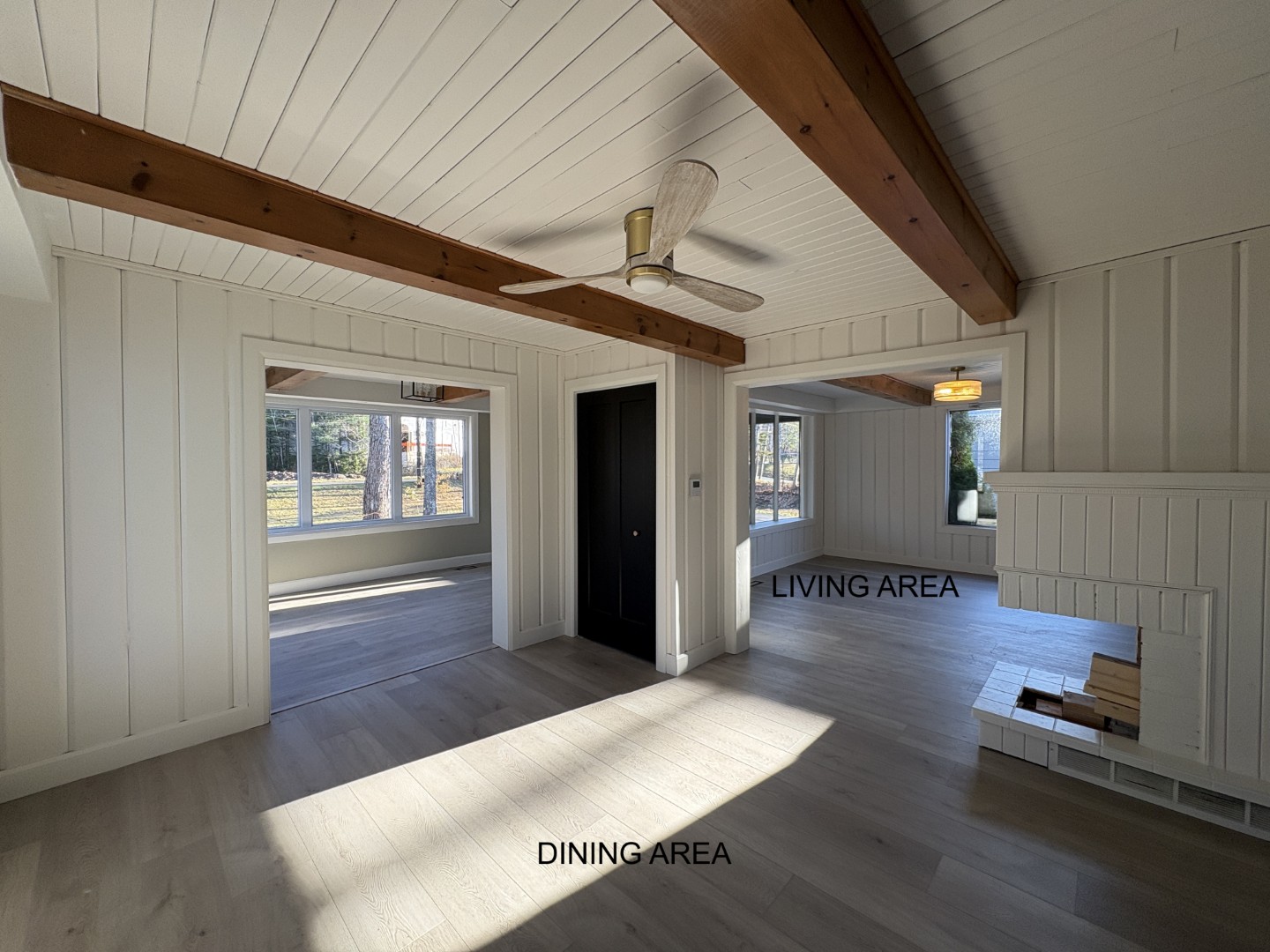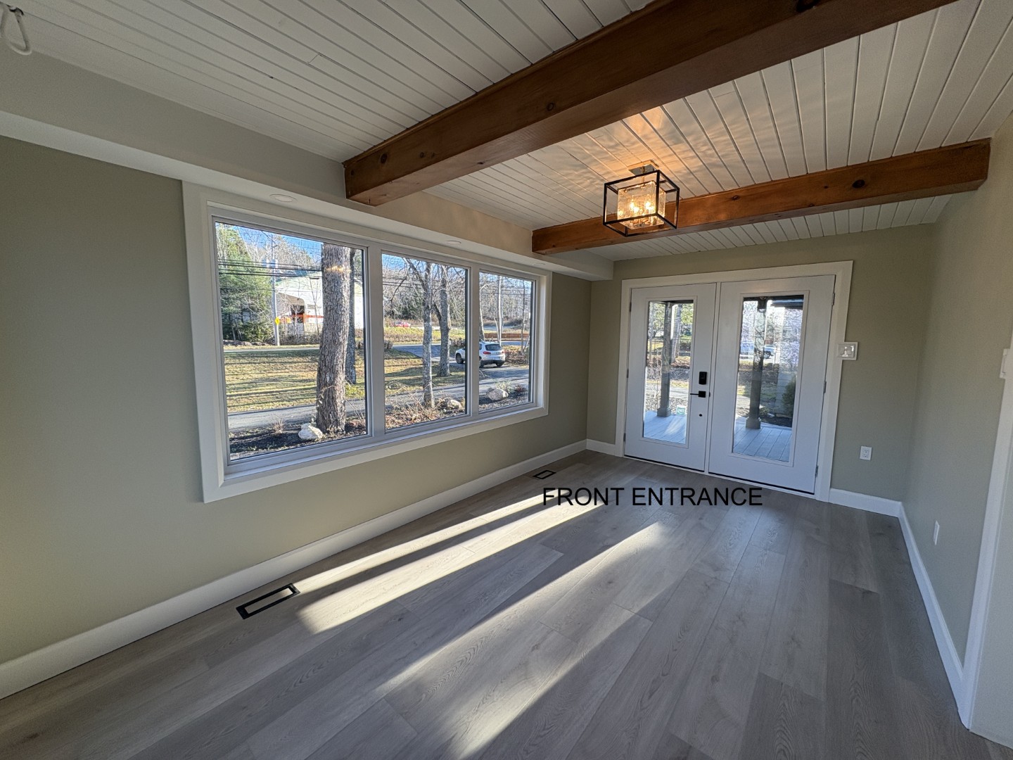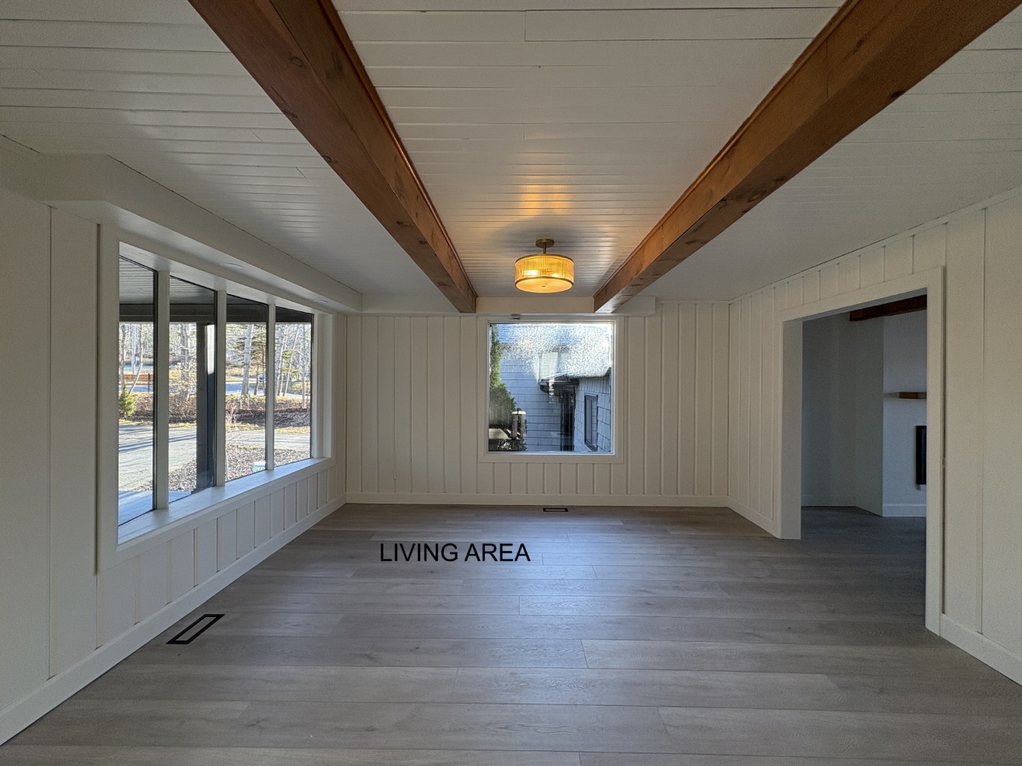 Exposed wooden beams lend a warm and rustic feel throughout the space. Gorgeous views of Fletchers Lake from the rear deck. Dock is shared with your immediate neighbors only.