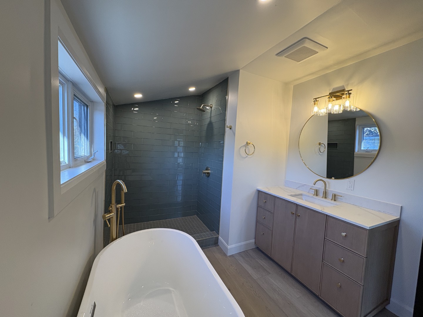 Upstairs you'll find two bedrooms, the primary with two closets. Beautiful 4-piece bath with soaker tub and custom-built shower.
