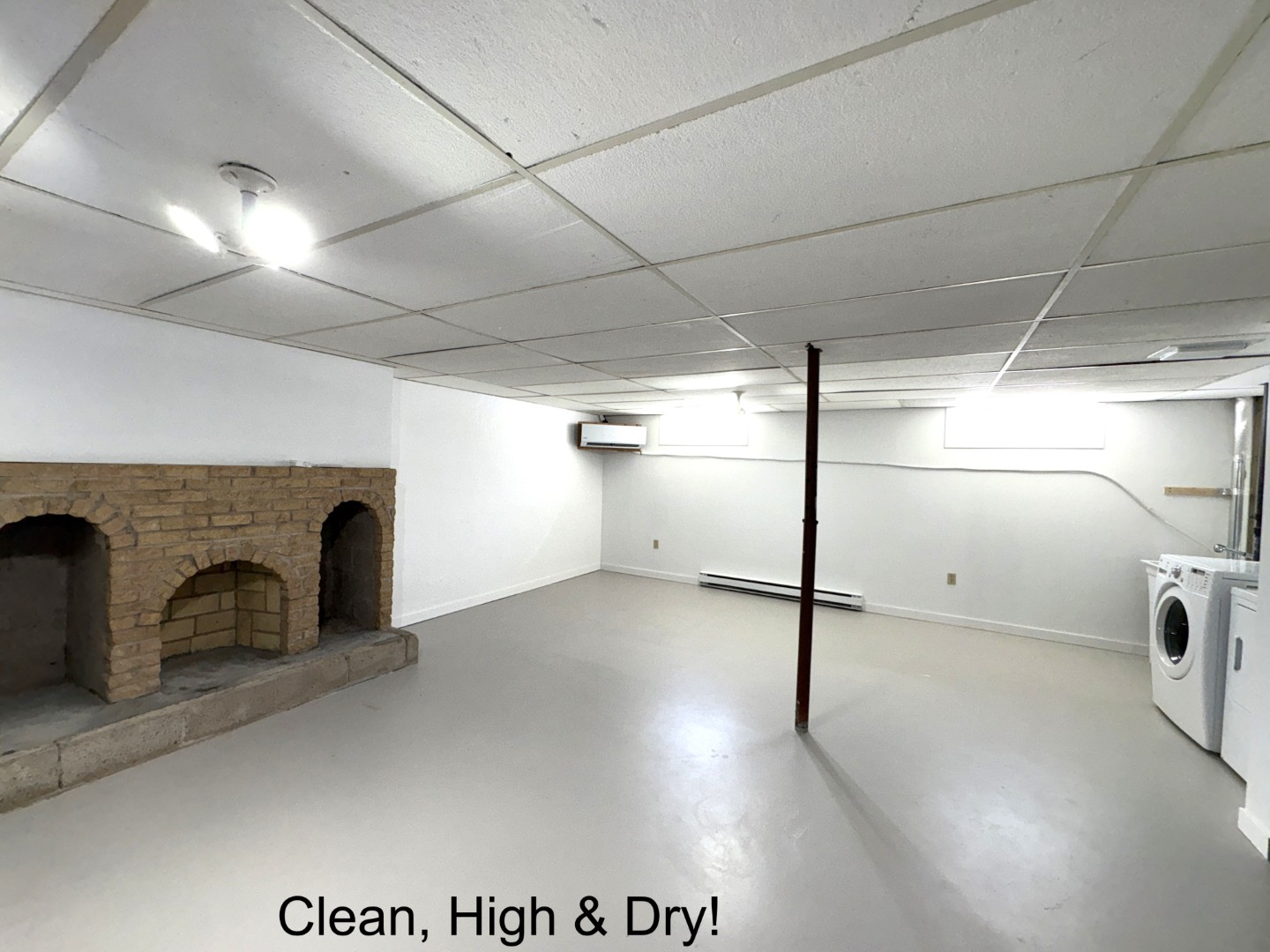 The basement has 7-foot ceilings, ornamental fireplace, Heat Pump and laundry.