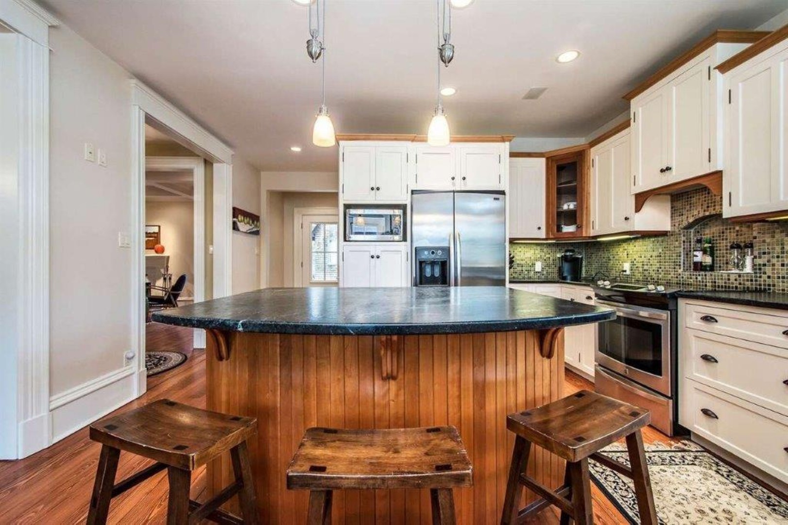 Completely renovated, 4-bedroom, 2 story home located on prestigious Shore Drive in Bedford. Handsome, wide pine floors and an abundance of natural light throughout this beautiful home. Stunning kitchen with soapstone counters, farmhouse sink, ample cabinet space, center island and adjoining eating area. Large formal living room features a coffered ceiling, wainscoting and ornamental fireplace.