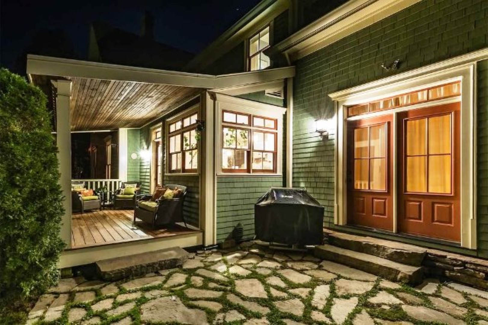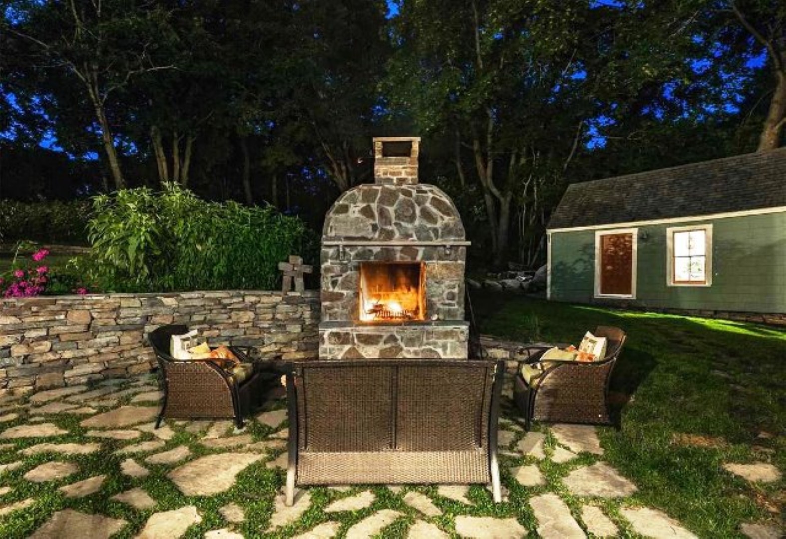 Beautifully landscaped and expansive yard offers lovely terrace area with stone fireplace.