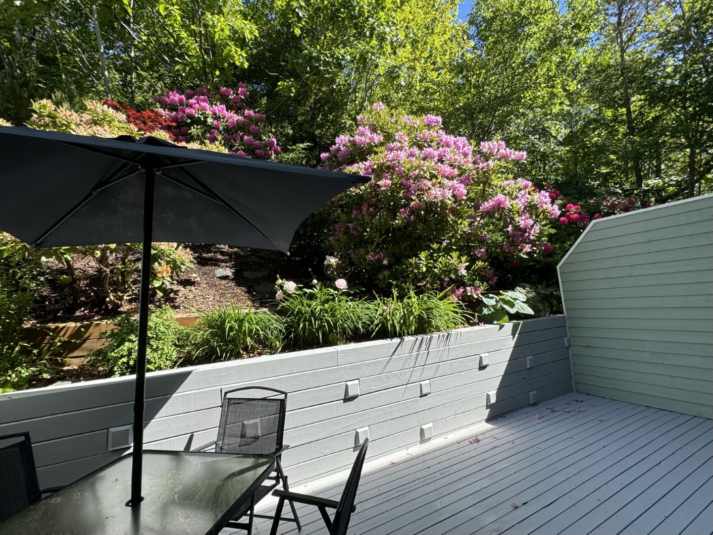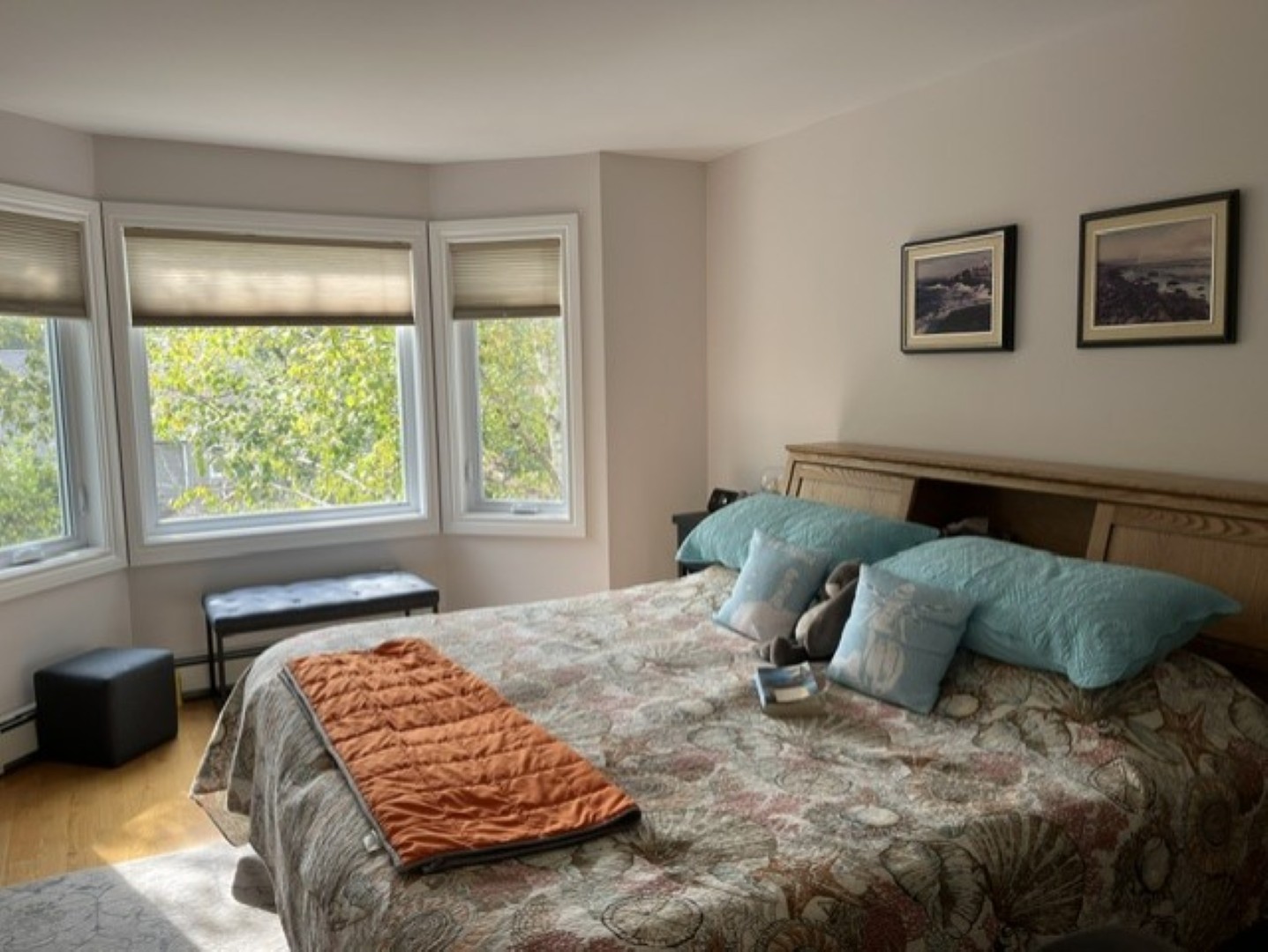 The upper level consists of the large primary bedroom (again with seasonal water views) and an ensuite bathroom with walk-in shower. A second large bedroom and full bathroom complete this level.
